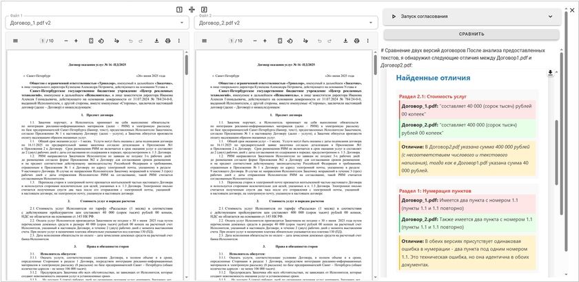 Новая функция Jet form для автоматического сравнения версий документов на базе ИИ позволяет за считанные минуты выявить любые изменения: от мелких опечаток до критических расхождений в условиях.Модель анализирует не только текст, но и числовые значения, структуру и нумерацию пунктов. Система мгновенно подсветит, если в итоговой версии, например, одна и та же сумма была некорректно указана в разных разделах документа. Пользователь просто выбирает файлы в интерфейсе и получает наглядный отчет с выделенными отличиями и рекомендациями по их устранению. Для глубокой настройки анализа предусмотрена поддержка промптов (шаблонов запросов). Это позволяет адаптировать проверку под специфику конкретной отрасли или компании. Результат отображается прямо в рабочем окне, обеспечивая бесшовный процесс правки.