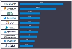 ИТ-маркетплейс Market.CNews опубликовал рейтинг систем электронного документооборота 2023. Аналитики провели сравнение возможностей, кроссплатформенности и цен на решения, представленные на российском рынке. Лидером рейтинга признана СЭД ELMA365 ECM от компании ELMA. Она обладает широким функционалом и развитым маркетплейсом, что в балльной системе нивелирует отсутствие некоторых сертификатов безопасности и относительно короткий тестовый период. Уровень цен — средний. На втором месте — Directum RX от компании Directum. У этого решения наблюдается баланс по всем основным параметрам рейтинга. Новым клиентам предлагается к изучению демо-версия, уровень цен на основной продукт — низкий. Третье место заняла СЭД ТЕЗИС от компании Хоулмонт. Здесь стоит отметить широкий функционал, а также кроссплатформенность, наличие сертификатов безопасности. Тестовый период — до 180 дней, уровень цен — средний.