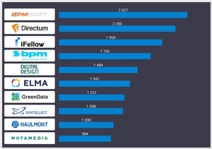 ИТ-маркетплейс Market.CNews опубликовал рейтинг BPM-систем 2021. Аналитики провели сравнение функциональных возможностей, форматов поставки и других характеристик. Лидером рейтинга стала платформа Creatio от компании Террасофт. Данное решение характеризуется широким функционалом, огромным маркетплейсом и развитой сетью партнеров по внедрению и поддержке решения. Второе место — у BPM ELMA от компании ELMA. Это решение отличается наиболее полным функционалом, различными форматами поставки и наиболее низкими ценами. На третьем месте — решение Битрикс 24. За год разработчики достигли явных успехов, усилив функциональные возможности платформы, а также существенно расширив партнерскую сеть и возможности маркетплейса.